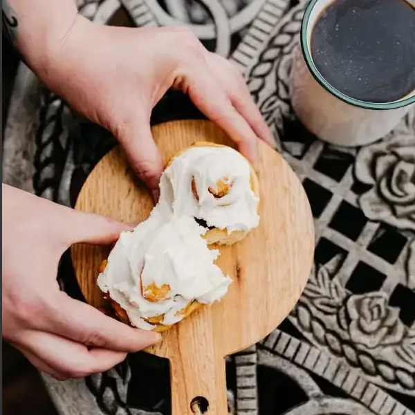 Six count pack of Stone Mill’s challah cinnamon rolls with buttercreme icing.